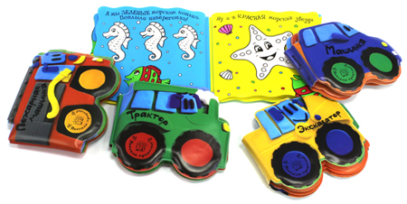 Эти книжки разве что в воду не опустишь, но для купания есть совсем другие — и тоже на колесиках. С таким трактором, пожарной машиной, экскаватором можно смело плескаться в ванне.